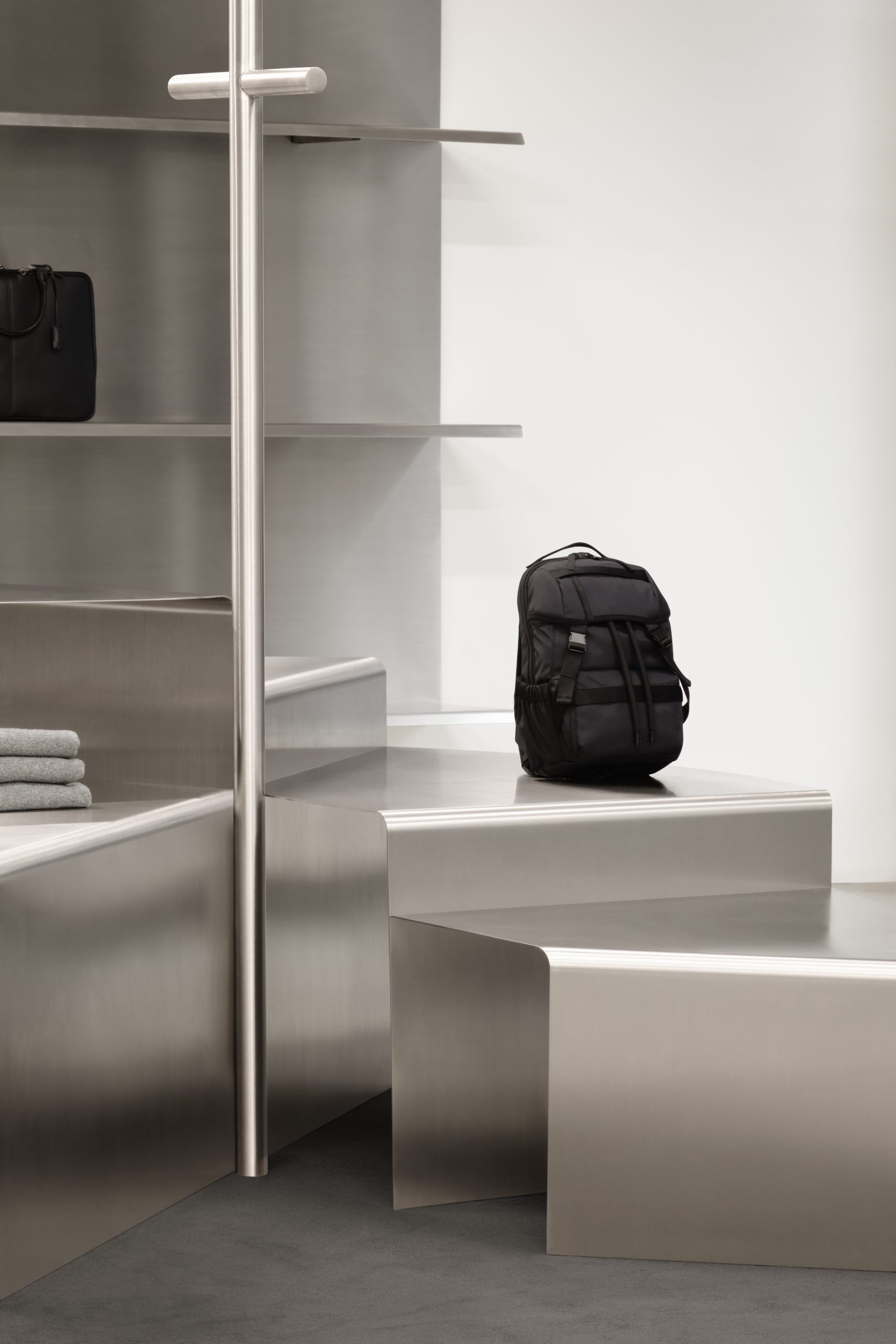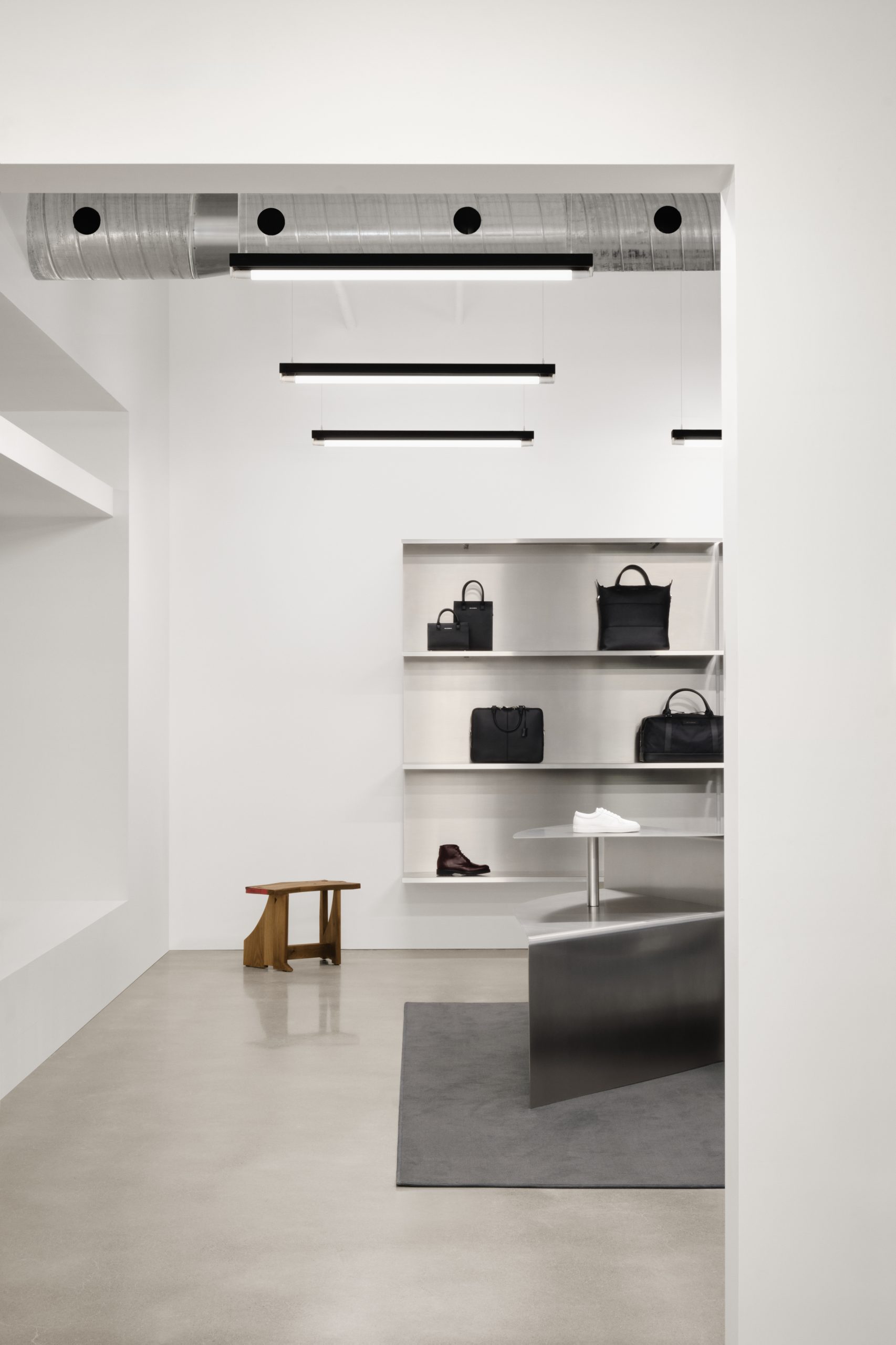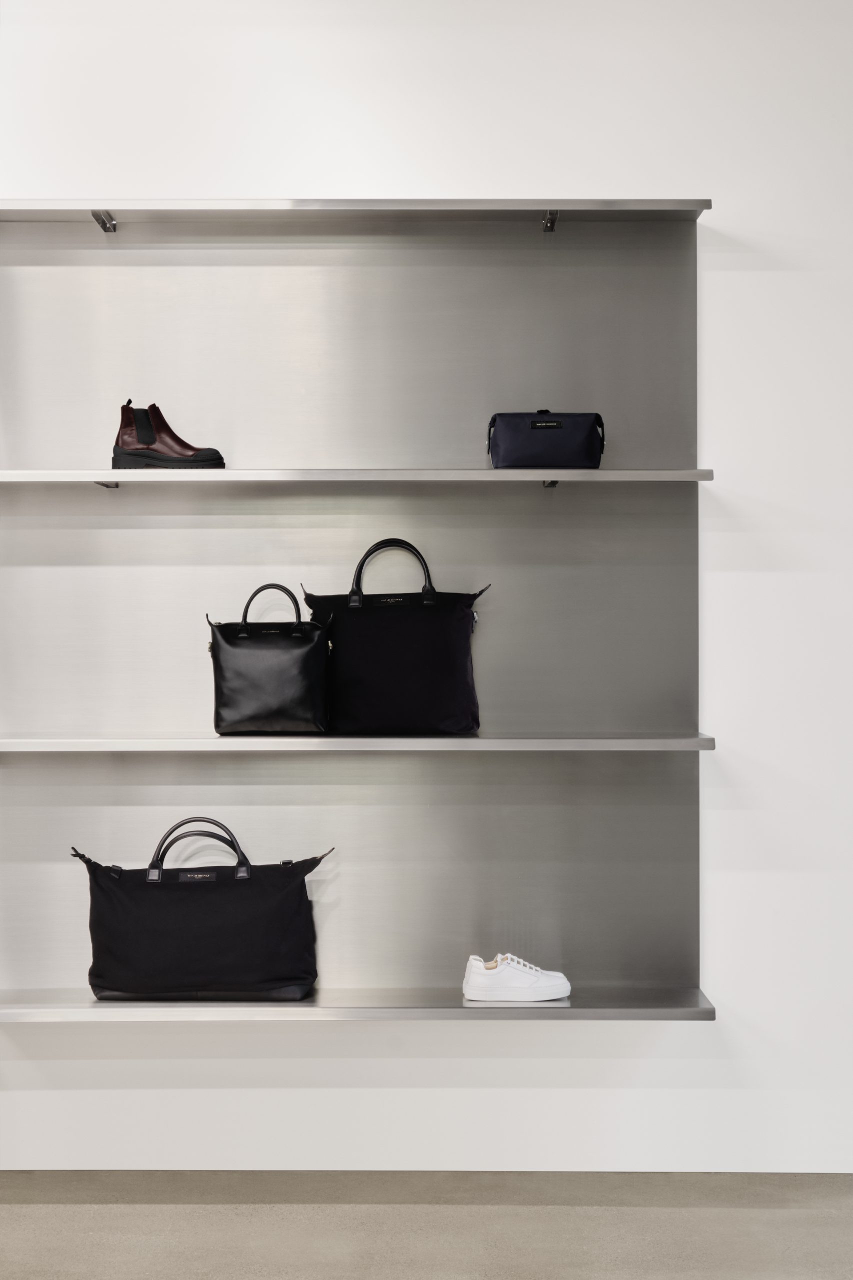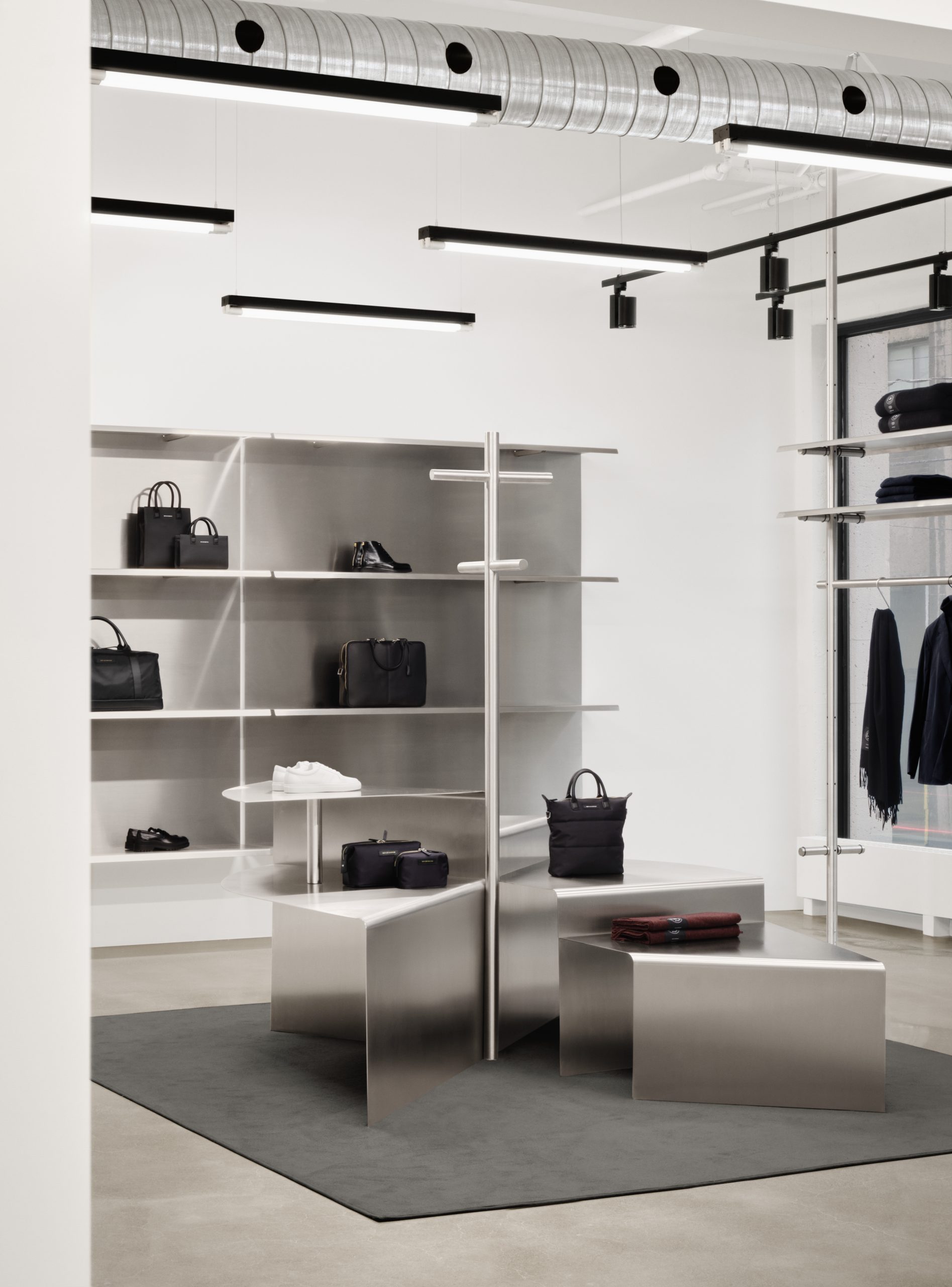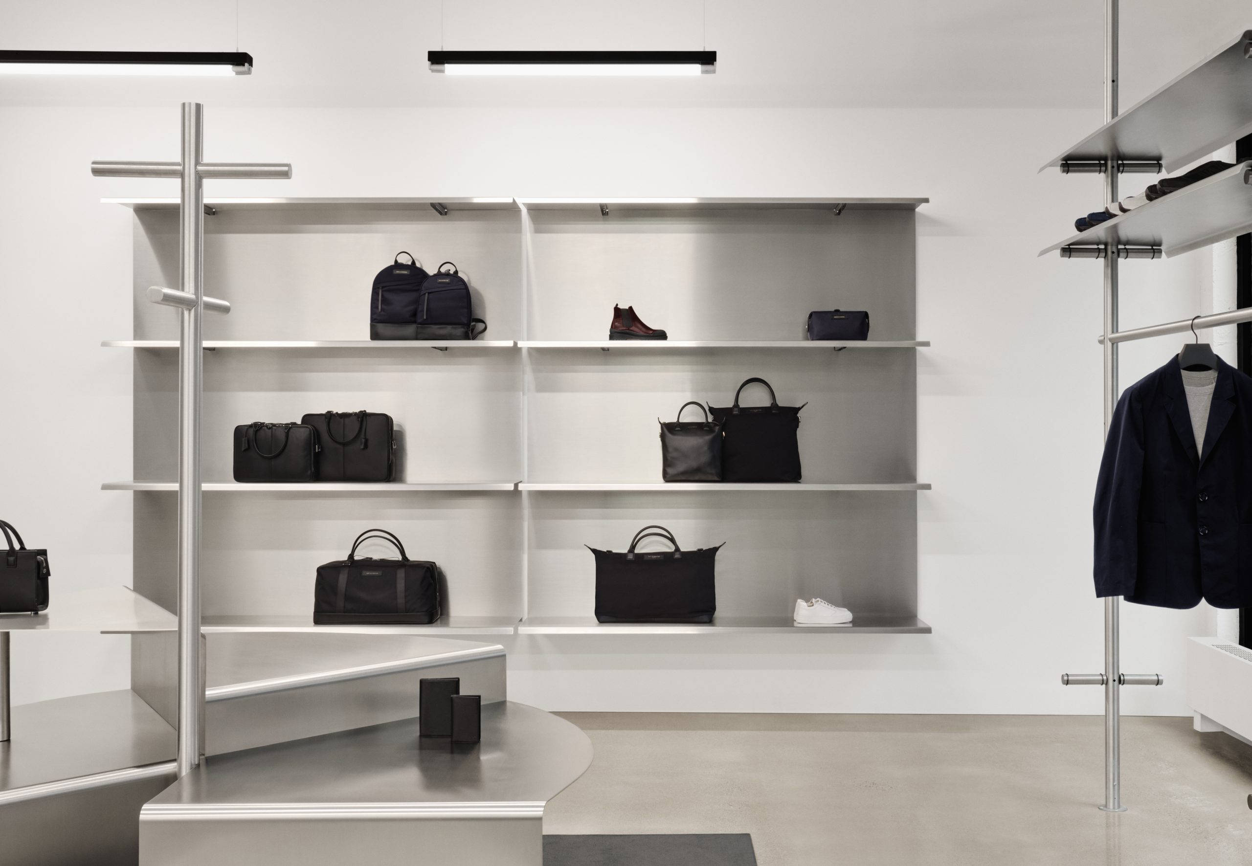 The boutique’s interior design draws upon WANT’s roots in travel, taking cues from mobile spaces like airports and train stations, airplane cabins and metro cars. Functional, timeless, and modular, the space complements WANT’s minimalist wardrobe for the modern traveller.