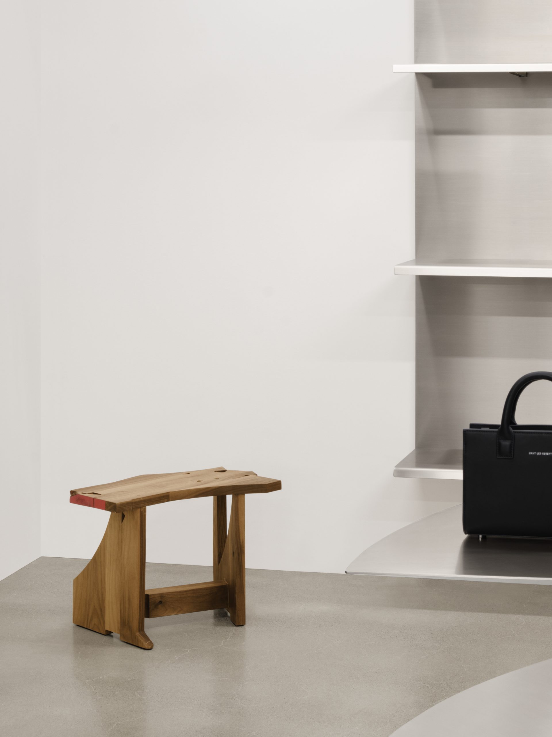 The boutique’s furniture references the precise construction of classic commercial aircraft while the space’s focal point, a sculptural stainless stee, shelving unit presenting the WANT capsule wardrobe, takes inspiration from airport baggage carousels. The interior is punctuated by solid wood furniture crafted by Lambert. Part of a series titled “Retailles”, these unique pieces are made from discarded wood recuperated from the manufacturing of furniture. “Retailles” is part of an ongoing project for the study of upcycling waste materials.